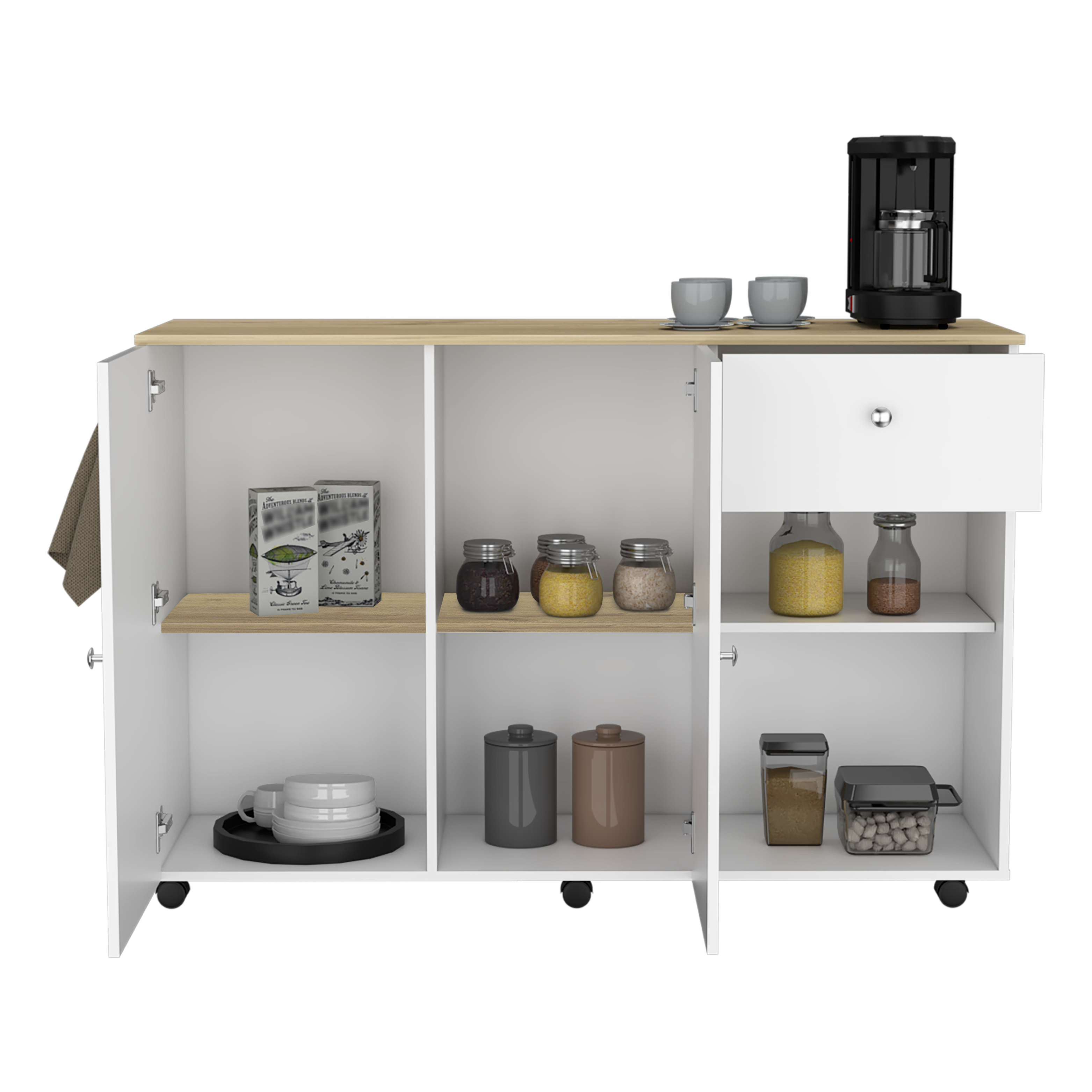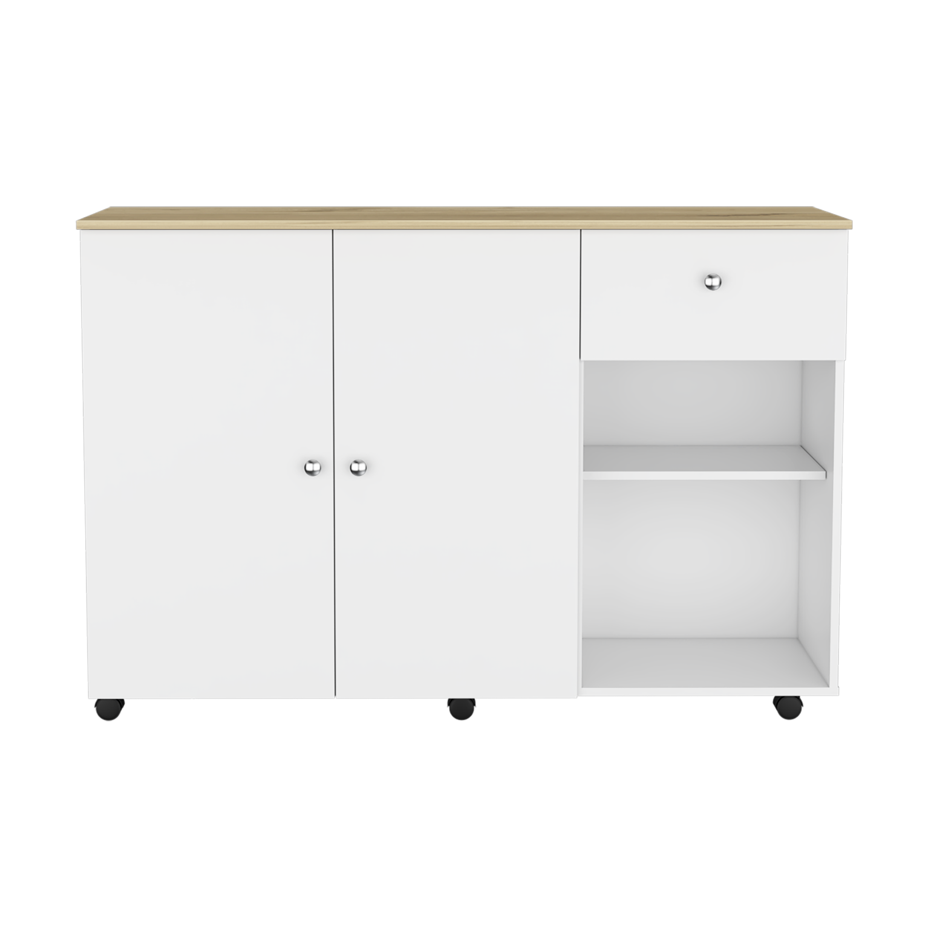 Isla de cocina amplia superficie en la mesa, dos puertas batientes, un cajon para almacenar objetos, dos entrepaños internos para almacenamiento, rodachinas con medidas de: ALTO 92 ANCHO 136 FONDO 46