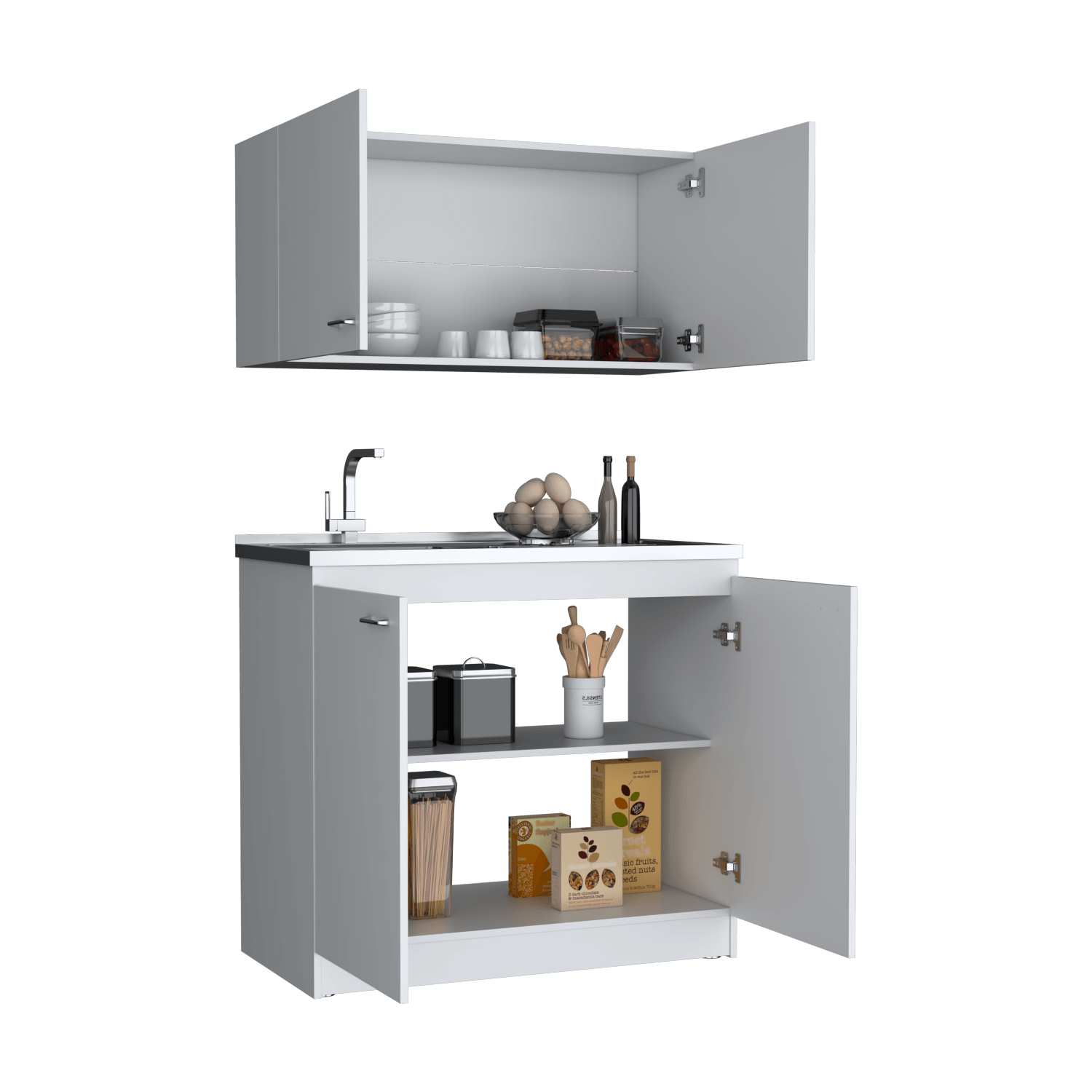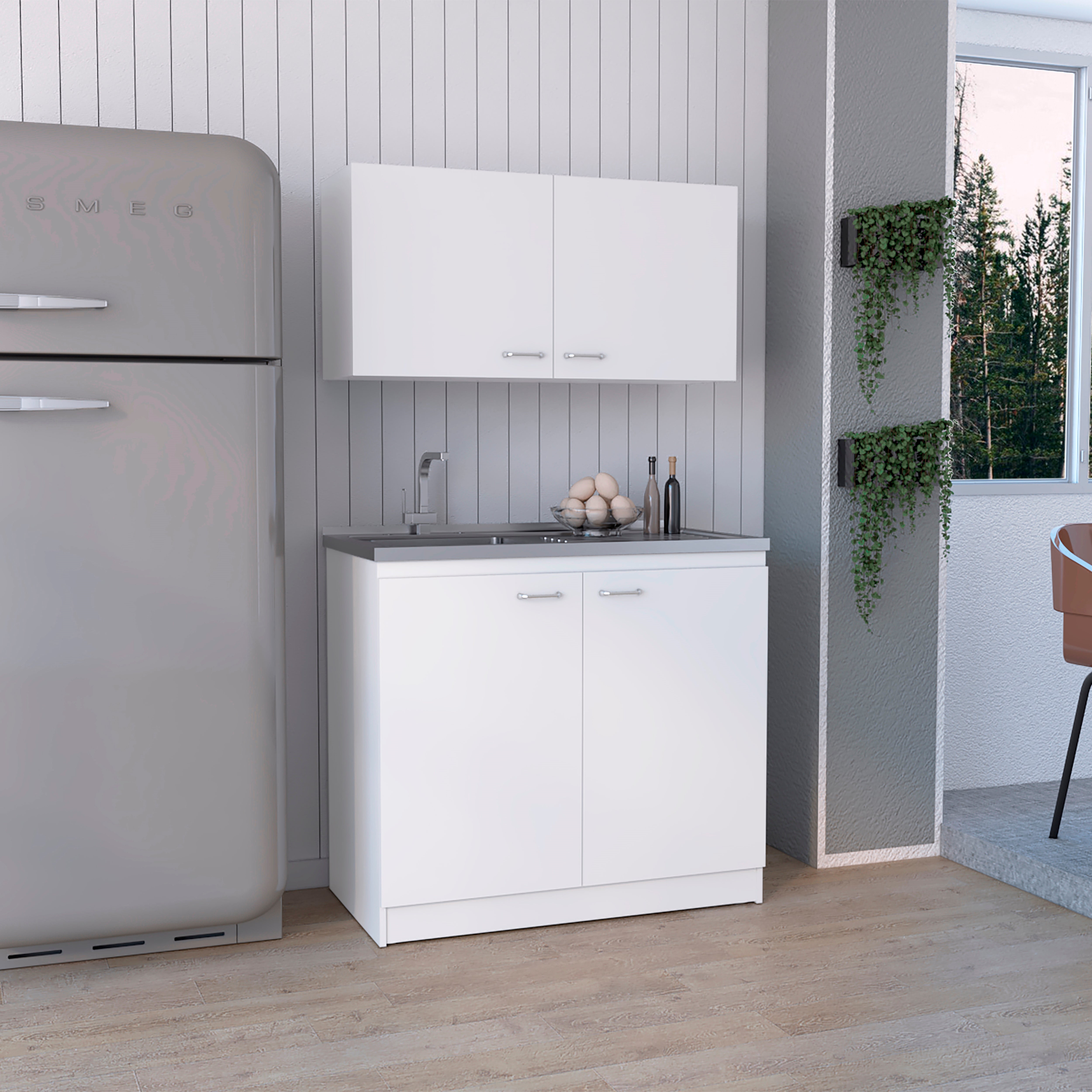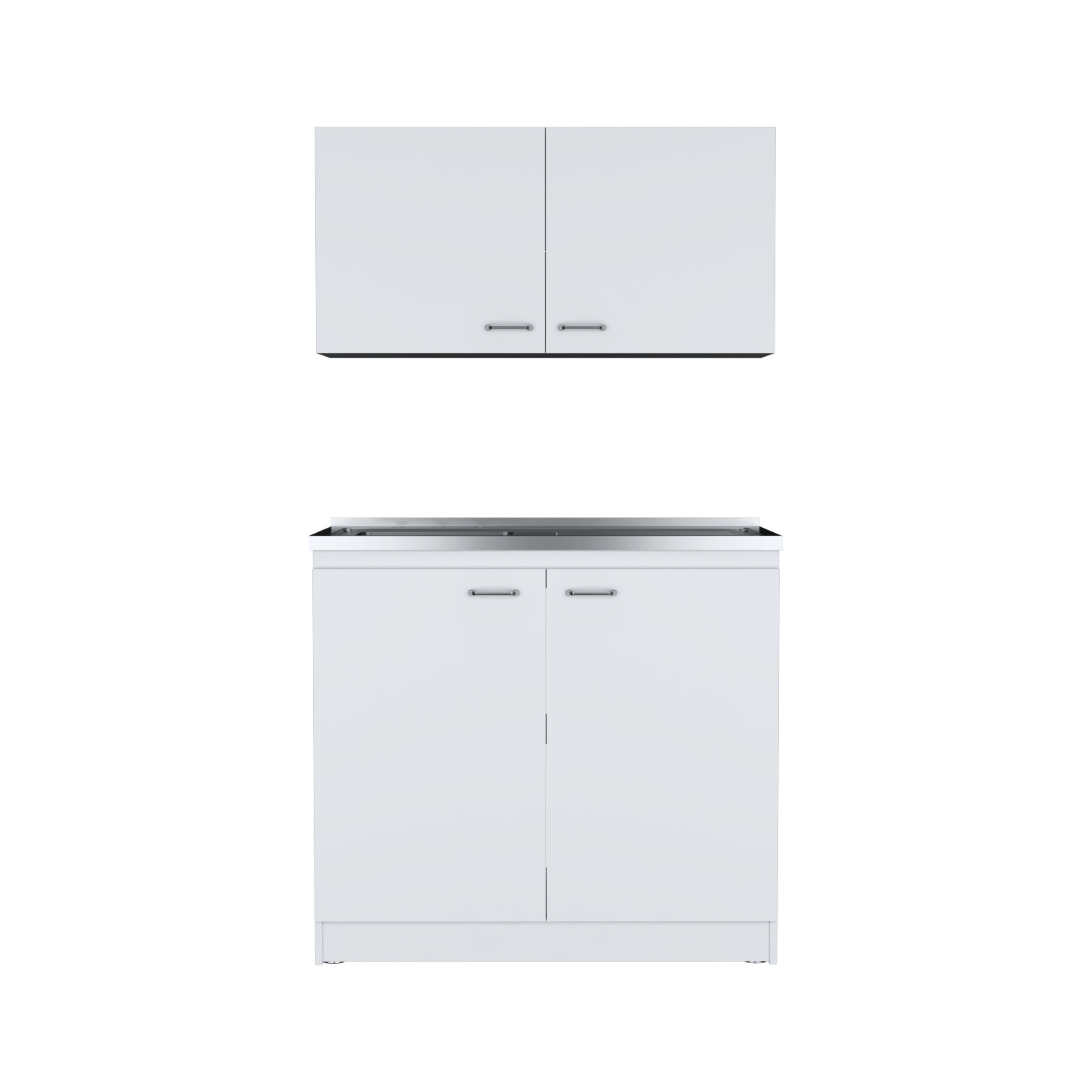 Kit de lavaplatos con mueble superior e inferior, practico meson con acero incluido, cuatro puertas abatibles, buena capacidad de almacenamiento, manijas metalicas, patas en acero cromado, facil instalacion a la pared con chazos, con medidas de ALTO 49/89 ANCHO 100 FONDO 3/52
