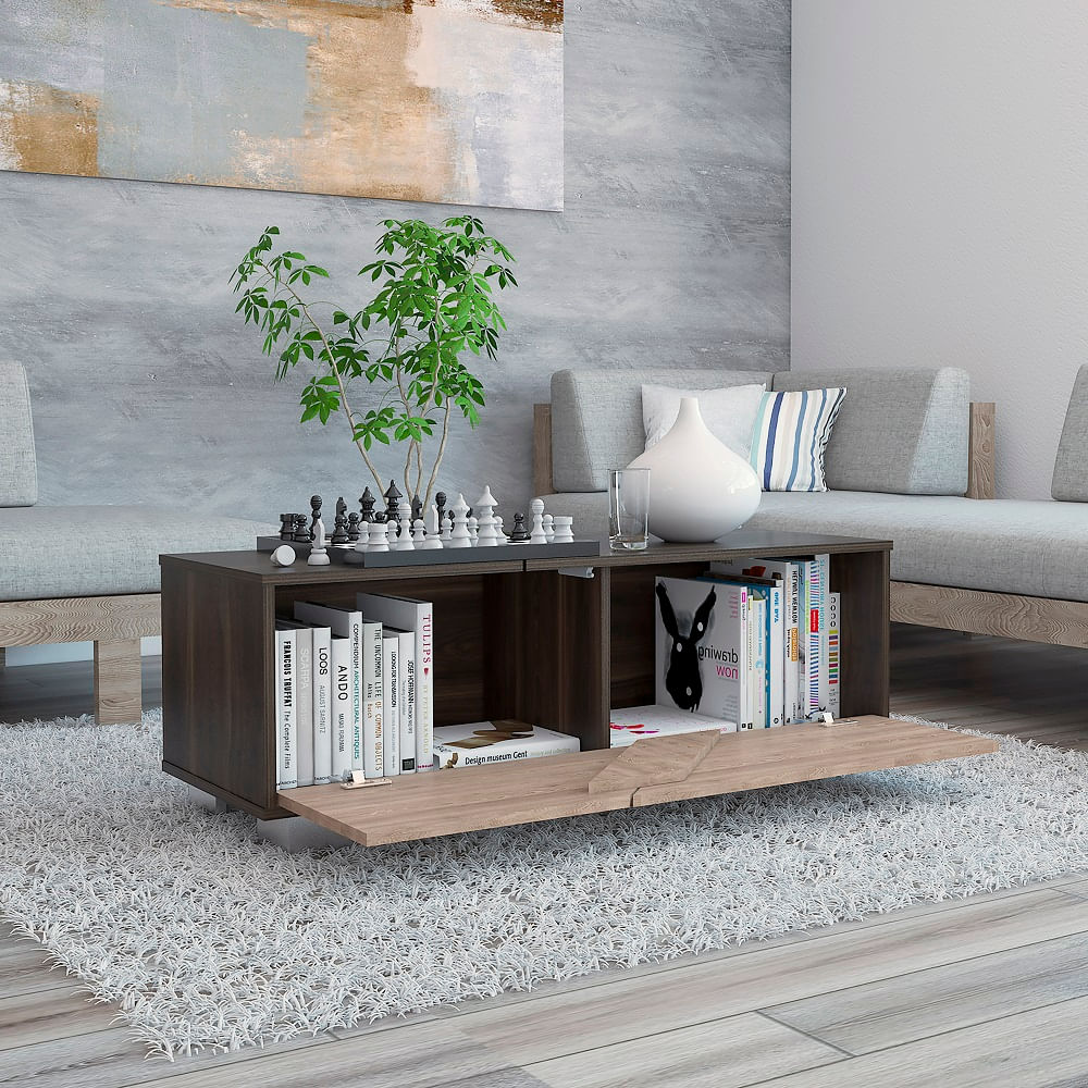 Mesa para sala hecha de madera aglomerada de 15mm. Cuenta con espacio ocultos para ubicar libros y objetos, una puerta y patas en acero. Medidas: 36,3cm alto, 104,3cm ancho, 38cm fondo y un peso de 16,2 kg NO INCLUYE ARMADO, Hecho de madera aglomerada, limpiar en seco, no productos abrasivos, ni humedad alta , La foto de este producto ha sido ambientada, por lo cual no incluye ningún adorno, ni accesorios, ni piezas adicionales ni ningún otro elemento que lo acompañan. El color presentado en la fotografía es una aproximación al color real.
