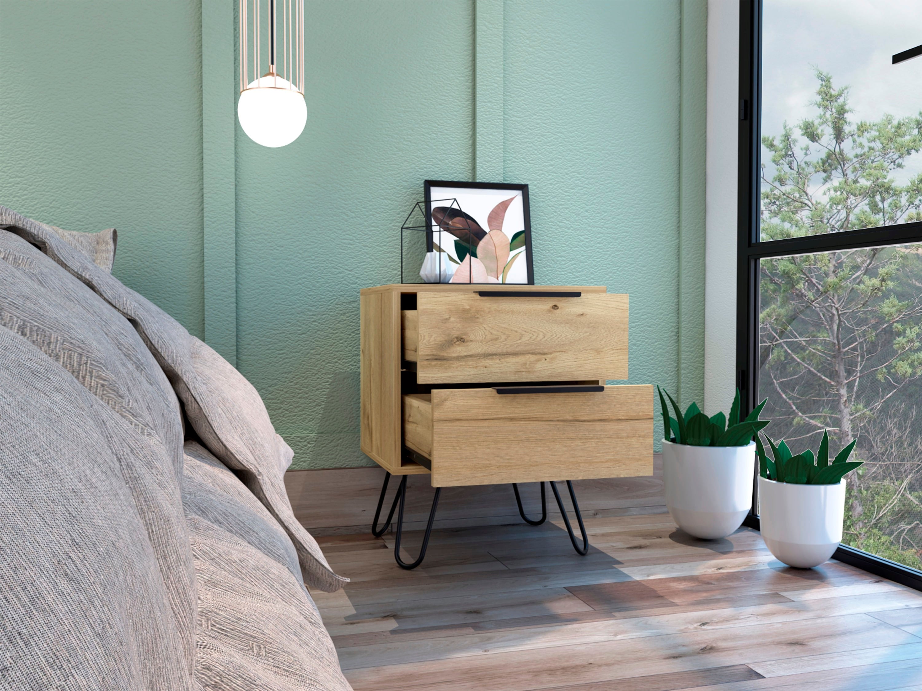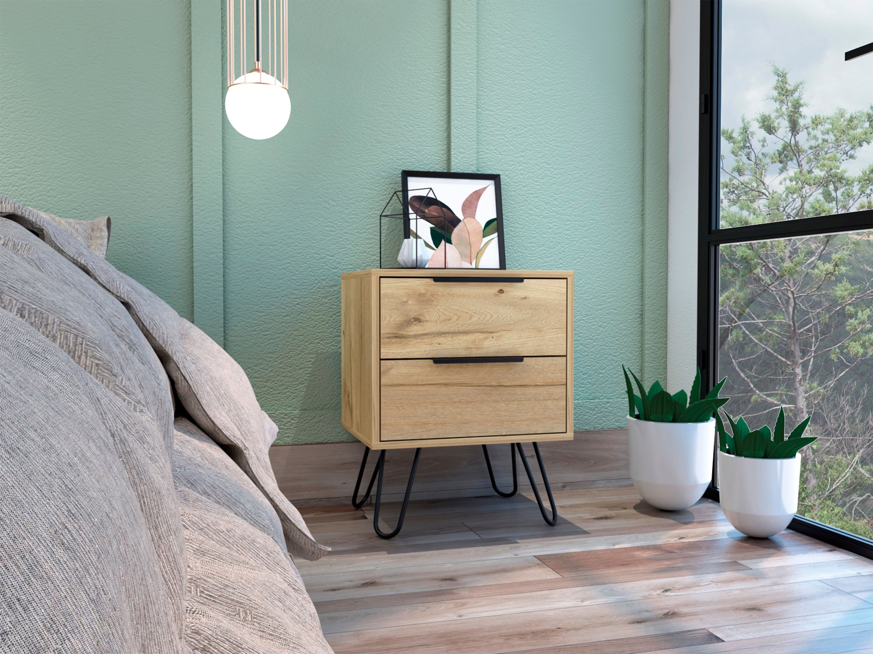 Mesa de noche con dos cajones, patas metalicas, dos manijas, soporta 26 kg con medidas de: ANCHO 45 ALTO 57 PROFUNDO 34,8
