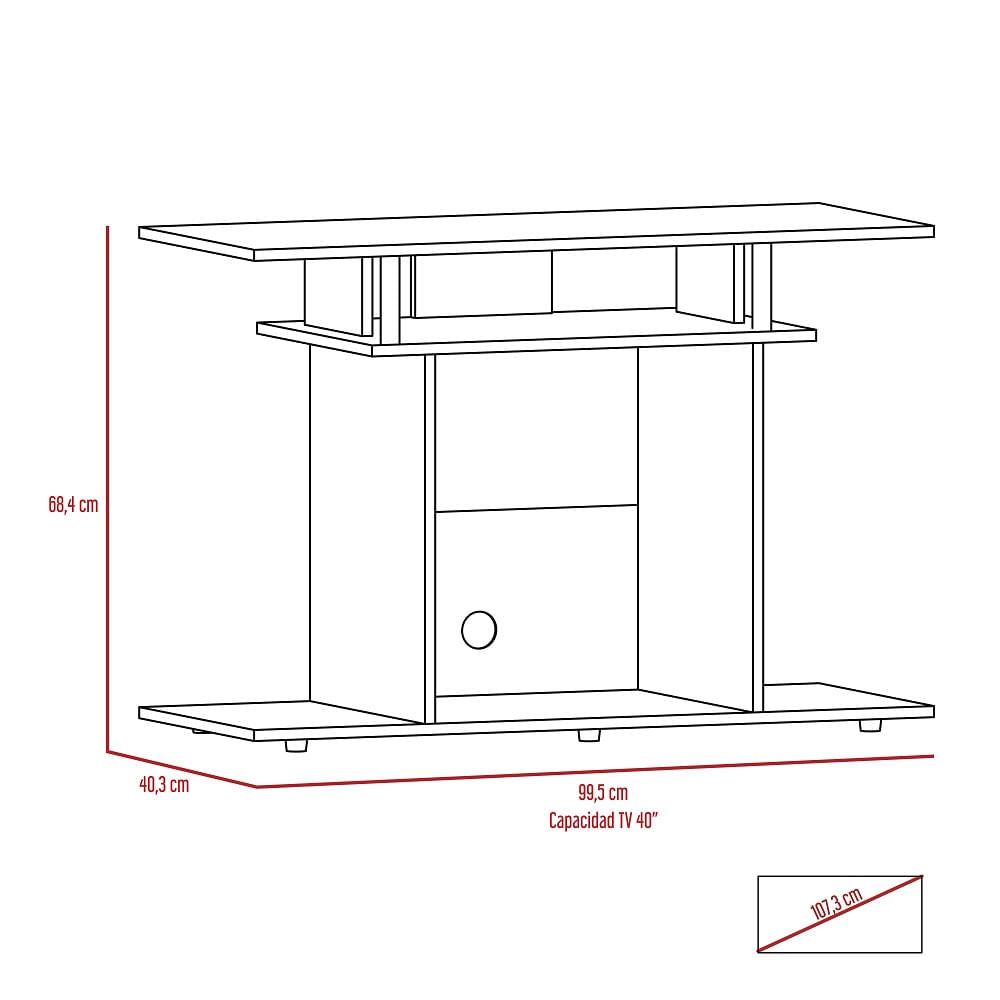 Linda mesa para televisor hecha de madera aglomerada de 15mm. Cuenta con espacio para televisores de hasta 40 pulgadas maximo, un diseño moderno con combinacion de colores, múltiples entrepaños y superficies para ubicar objetos. Medidas: 68,4cm alto, 99,5cm ancho, 40,3cm fondo y pesa 17,85kg NO INCLUYE ARMADO, Hecho de madera aglomerada, limpiar en seco, no productos abrasivos, ni humedad alta , La foto de este producto ha sido ambientada, por lo cual no incluye ningún adorno, ni accesorios, ni piezas adicionales ni ningún otro elemento que lo acompañan. El color presentado en la fotografía es una aproximación al color real.
