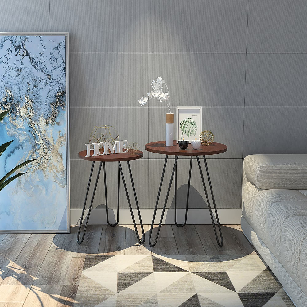 Hermosas mesas de sala hechas de madera aglomerada de 15mm con patas metálicas para ubicar objetos decorativos. Medidas: 59.5cm-54,5 alto, 50-40cm ancho, 50-40cm fondo y un peso de 7,4kg NO INCLUYE ARMADO, Hecho de madera aglomerada, limpiar en seco, no productos abrasivos, ni humedad alta , La foto de este producto ha sido ambientada, por lo cual no incluye ningún adorno, ni accesorios, ni piezas adicionales ni ningún otro elemento que lo acompañan. El color presentado en la fotografía es una aproximación al color real.