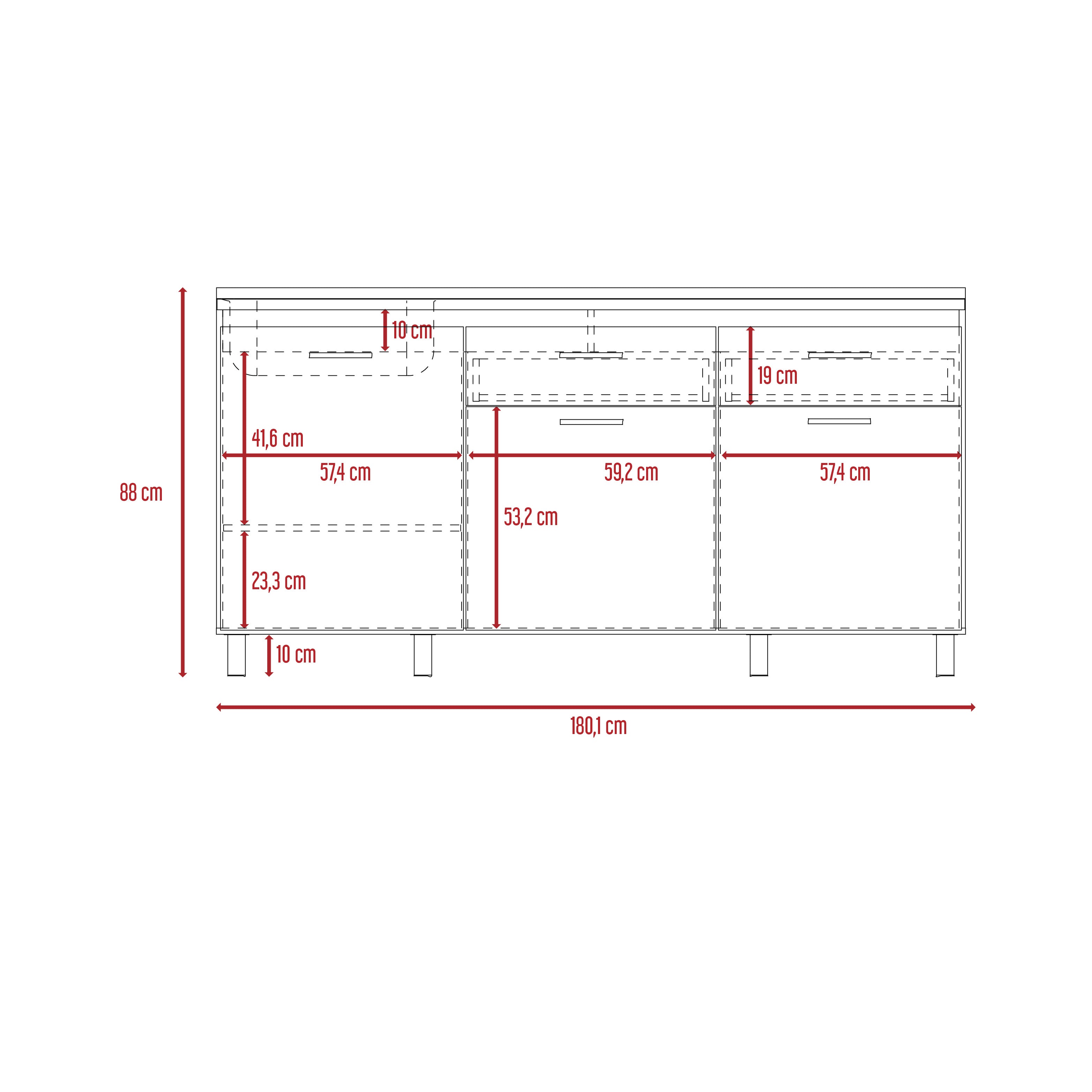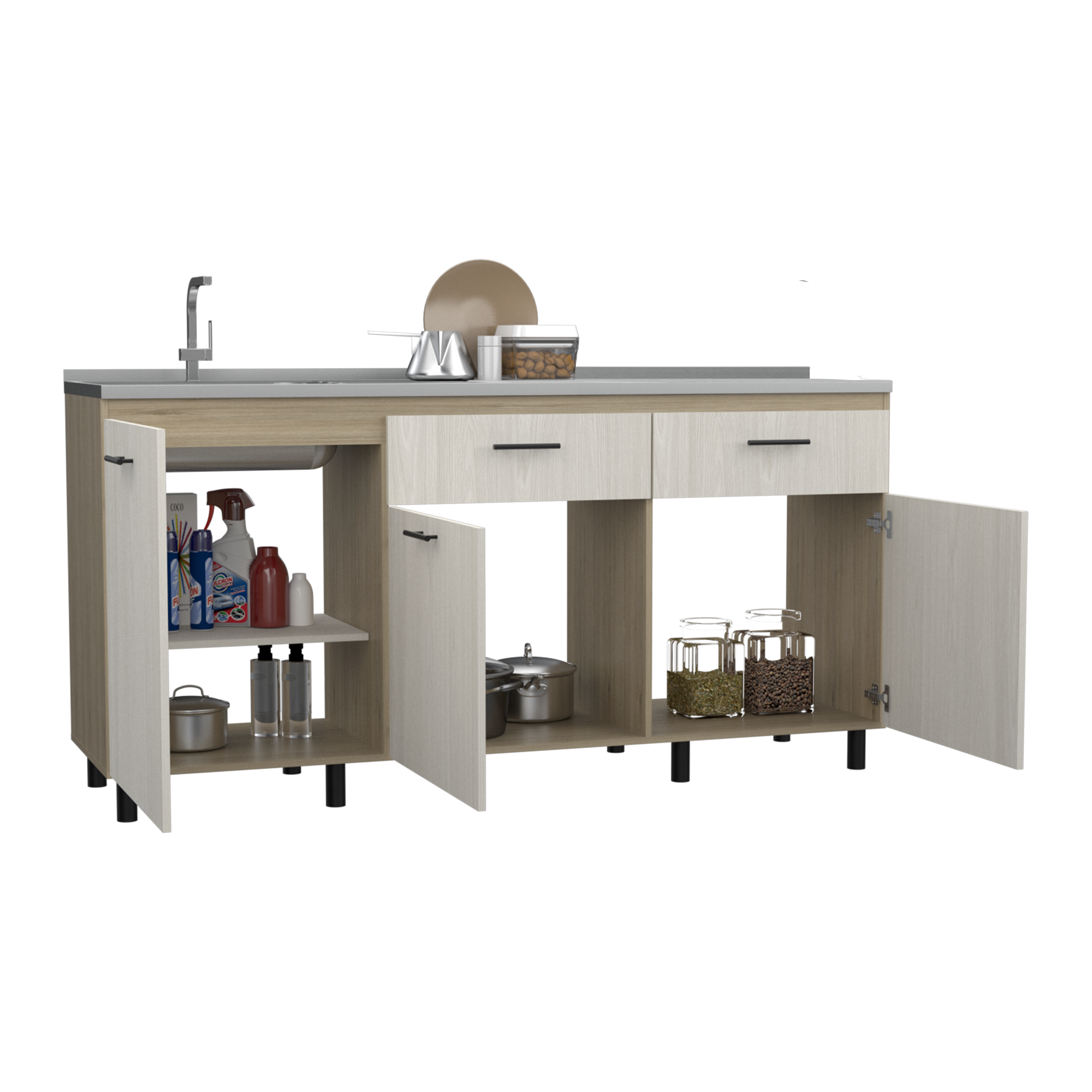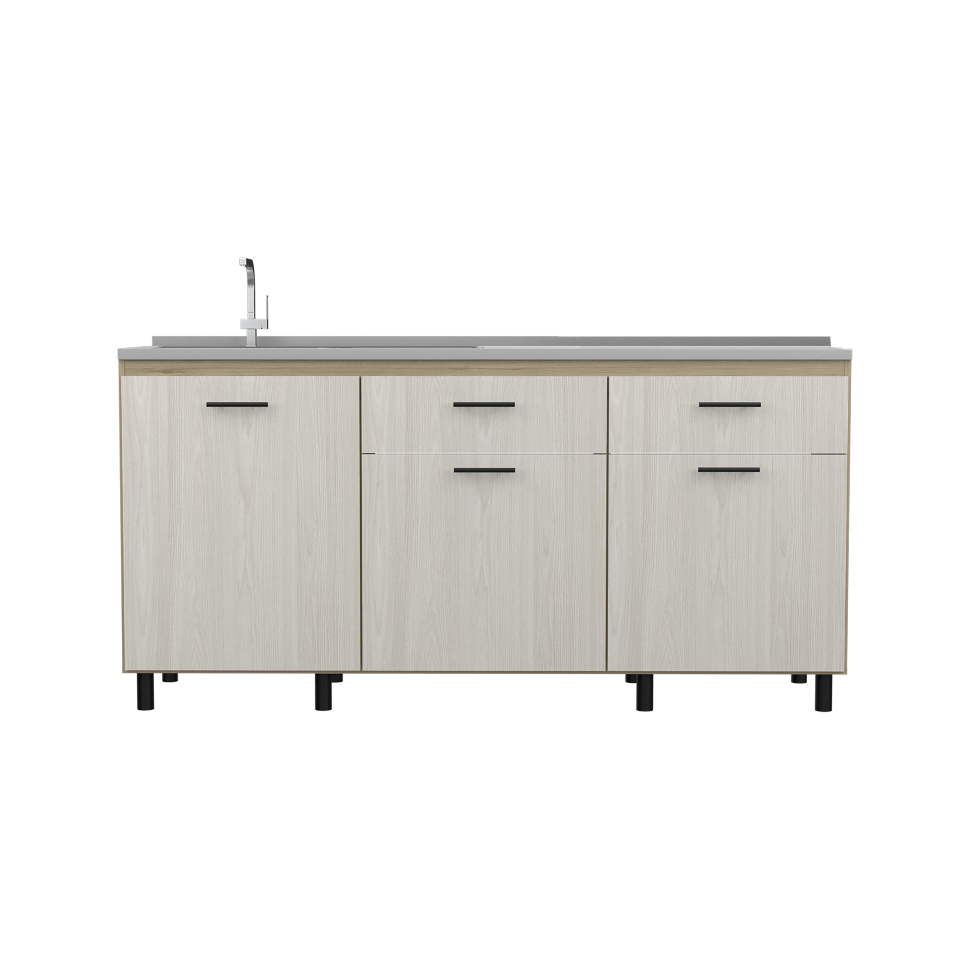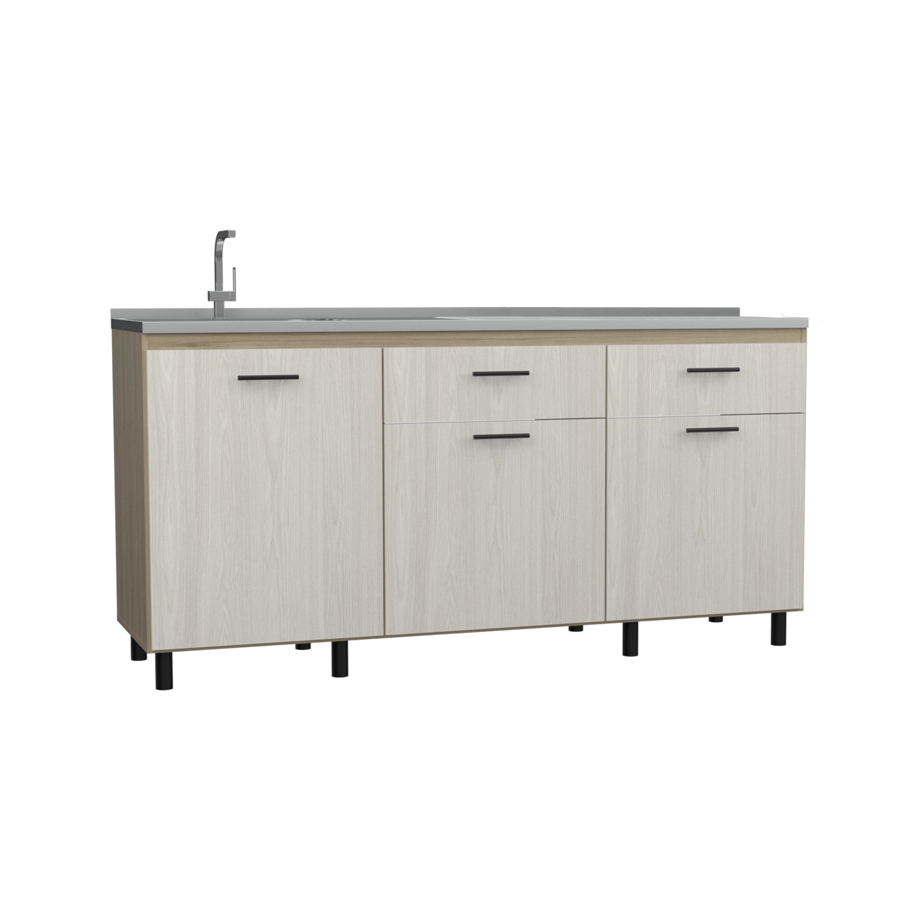 Mueble inferior cocina con tres puestas abatibles, dos cajones, manijas metalicas, patas metalicas incluye lavaplatos con medidas de: ALTO 89,5 ANCHO 180,1 FONDO 51,5