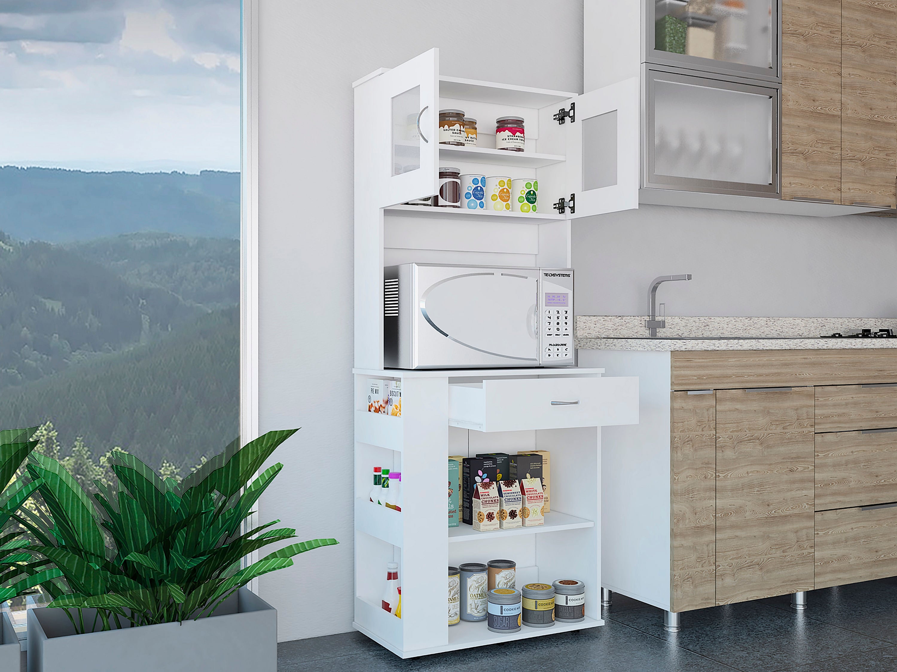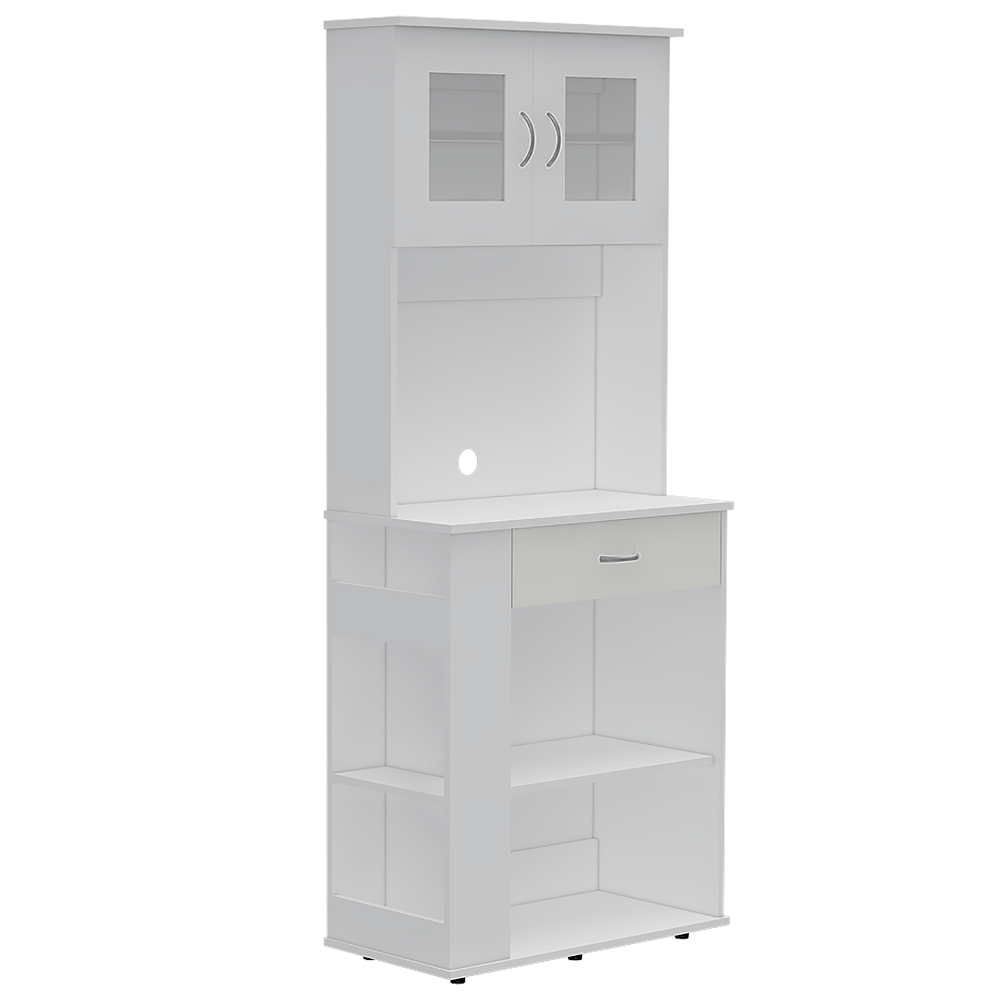 Dos puertas abatibles, espacio central para horno microondas de 54 cm de ancho, amplios espacios para guardar alimentos y electrodomesticos. Posee medidas en CM de: Alto: 170 Ancho: 70 Fondo: 35,3 y un peso en KG de : 32,8 NO INCLUYE ARMADO, Hecho de madera aglomerada, limpiar en seco, no productos abrasivos, ni humedad alta , La foto de este producto ha sido ambientada, por lo cual no incluye ningún adorno, ni accesorios, ni piezas adicionales ni ningún otro elemento que lo acompañan. El color presentado en la fotografía es una aproximación al color real.