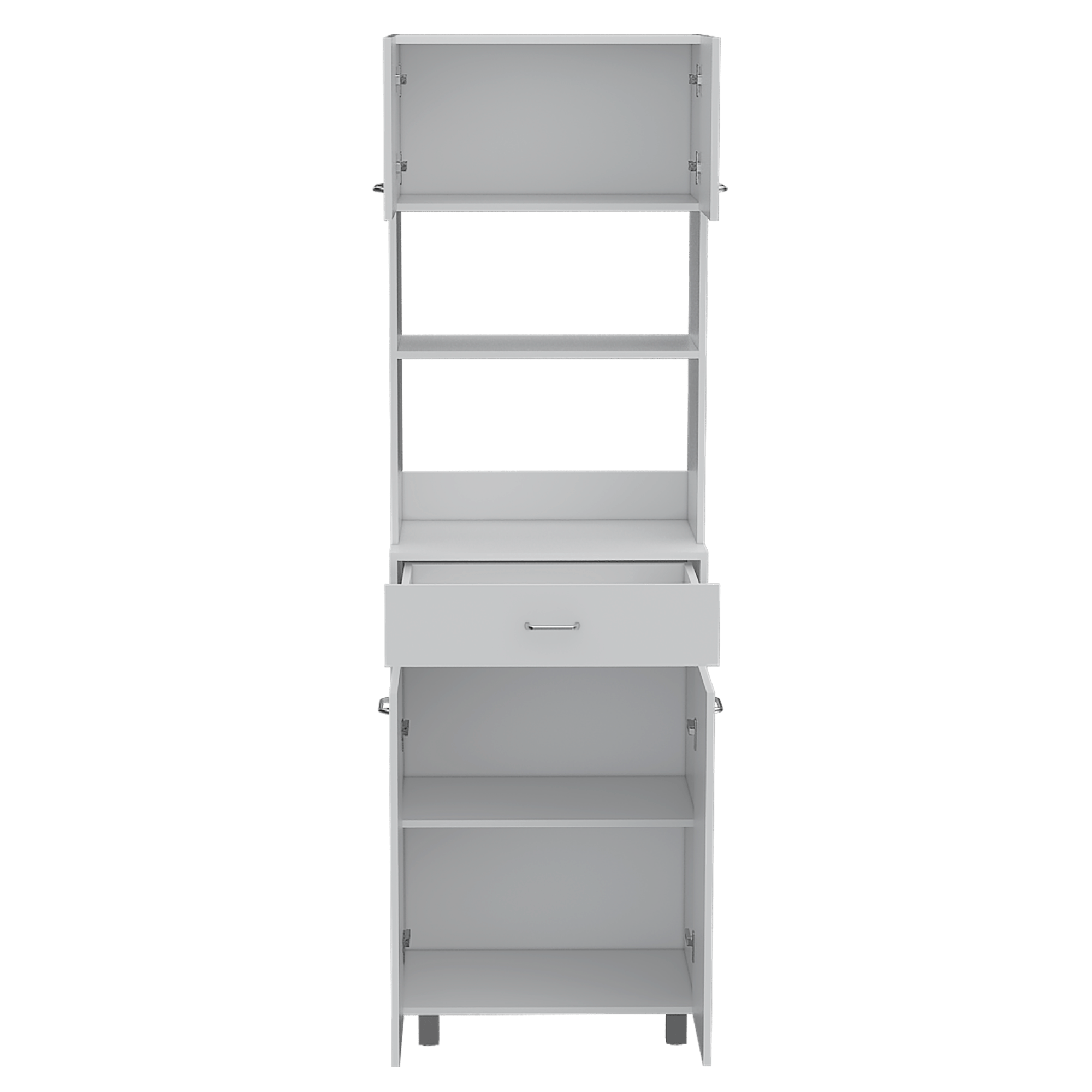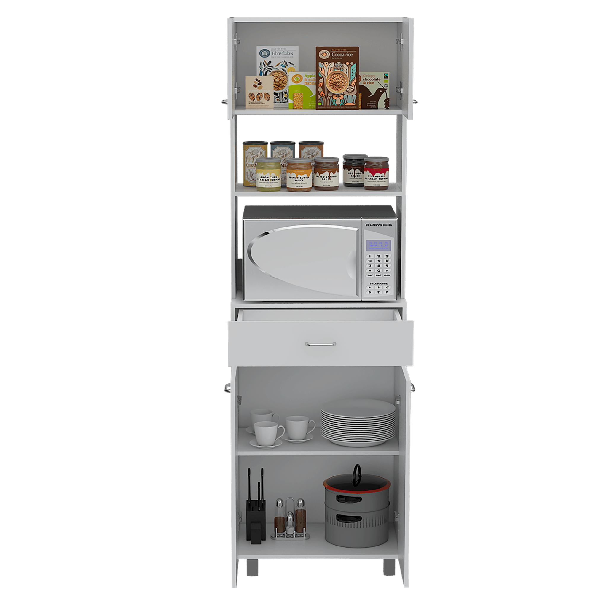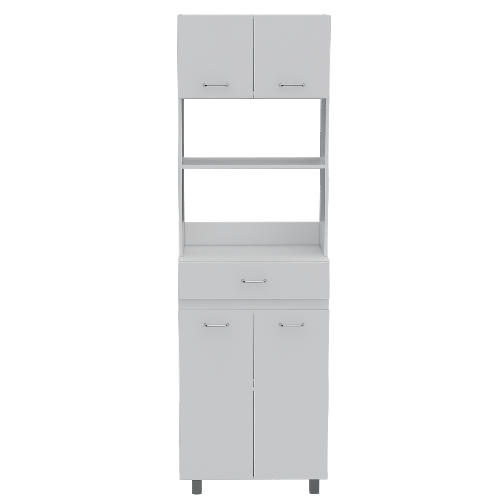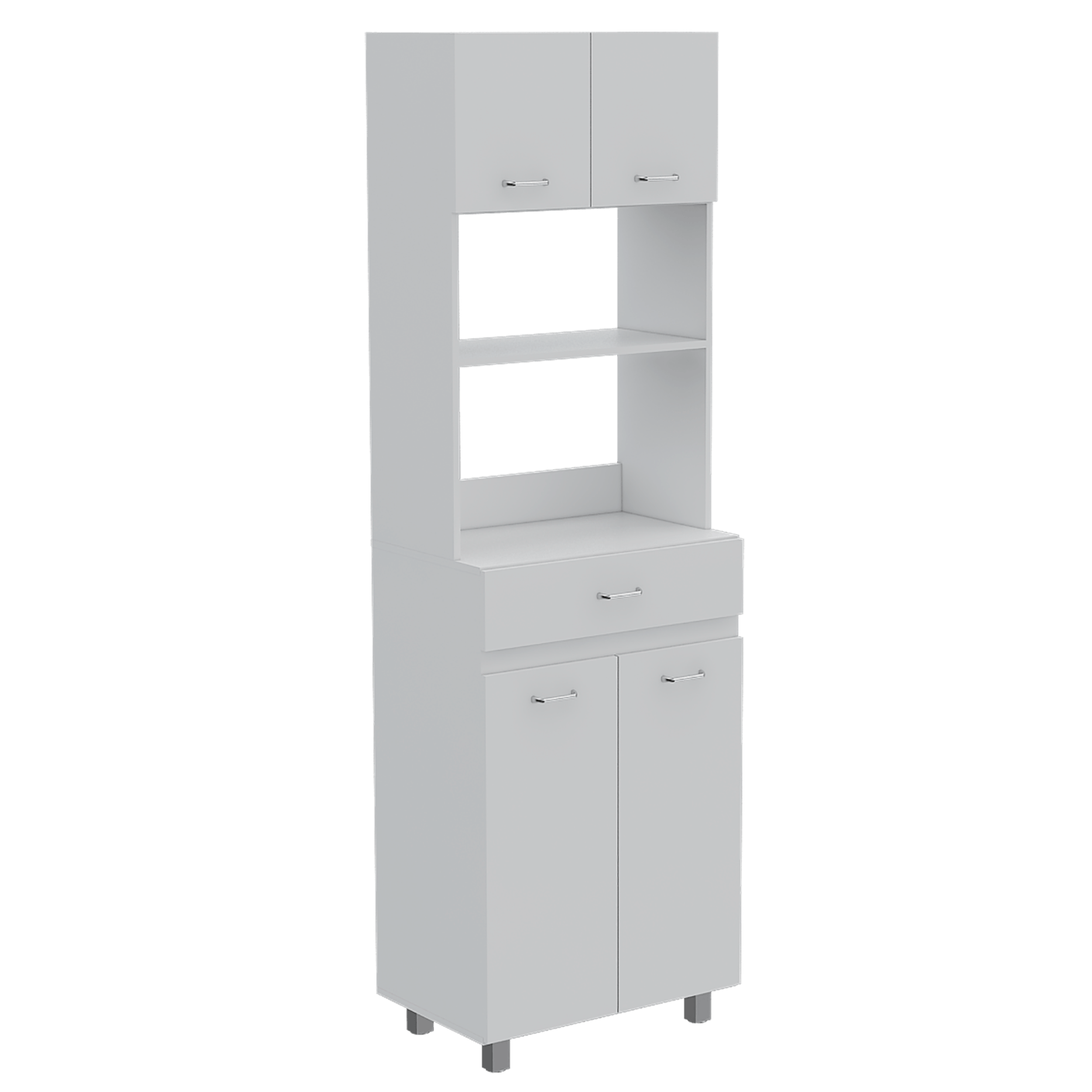 Mueble microondas con cuatro puertas abatibles, espacio central para microondas de hasta 58 cm de ancho, un cajon, amplios espacios para guardar alimentos con medidas de: ALTO 200 ANCHO 62,1 FONDO 40,8