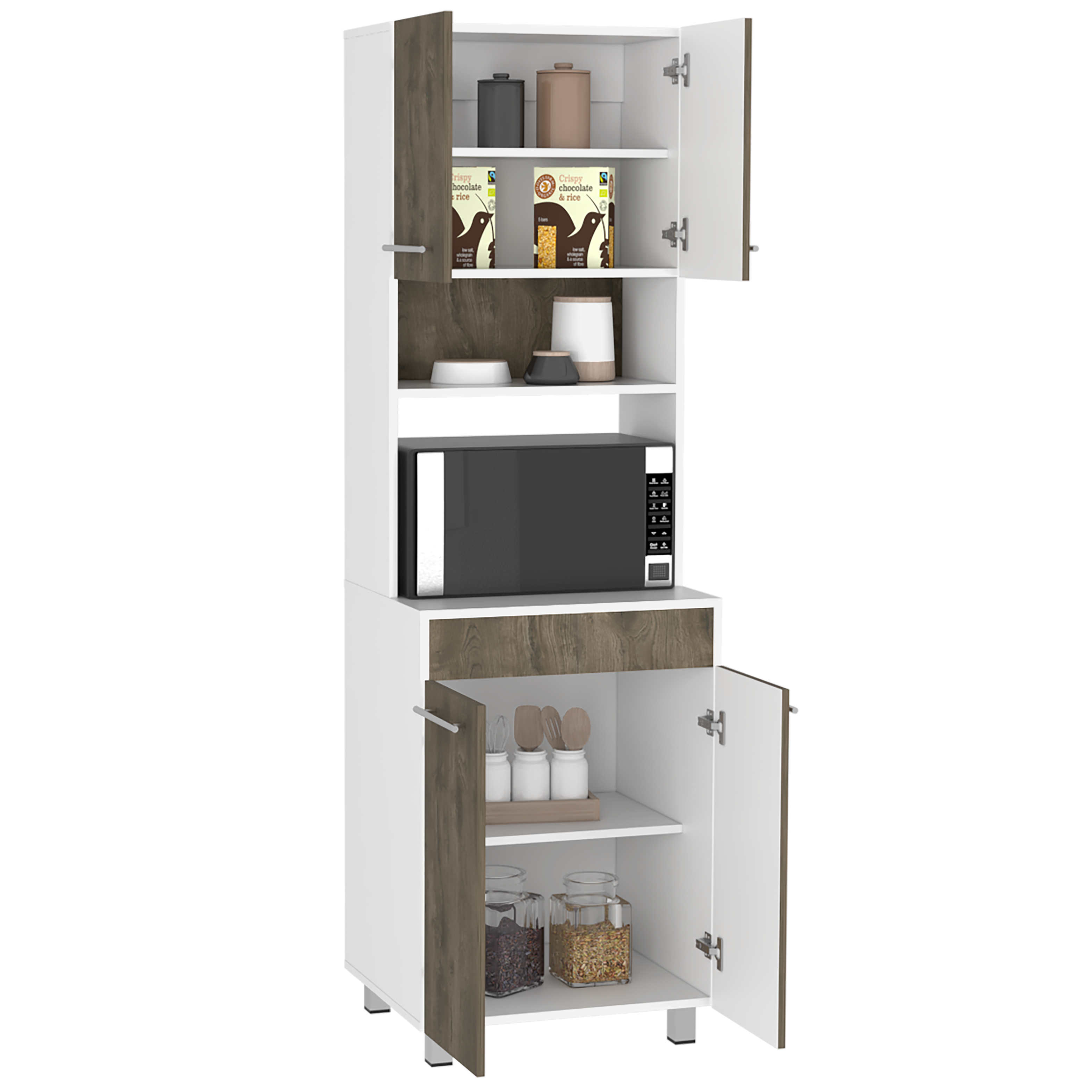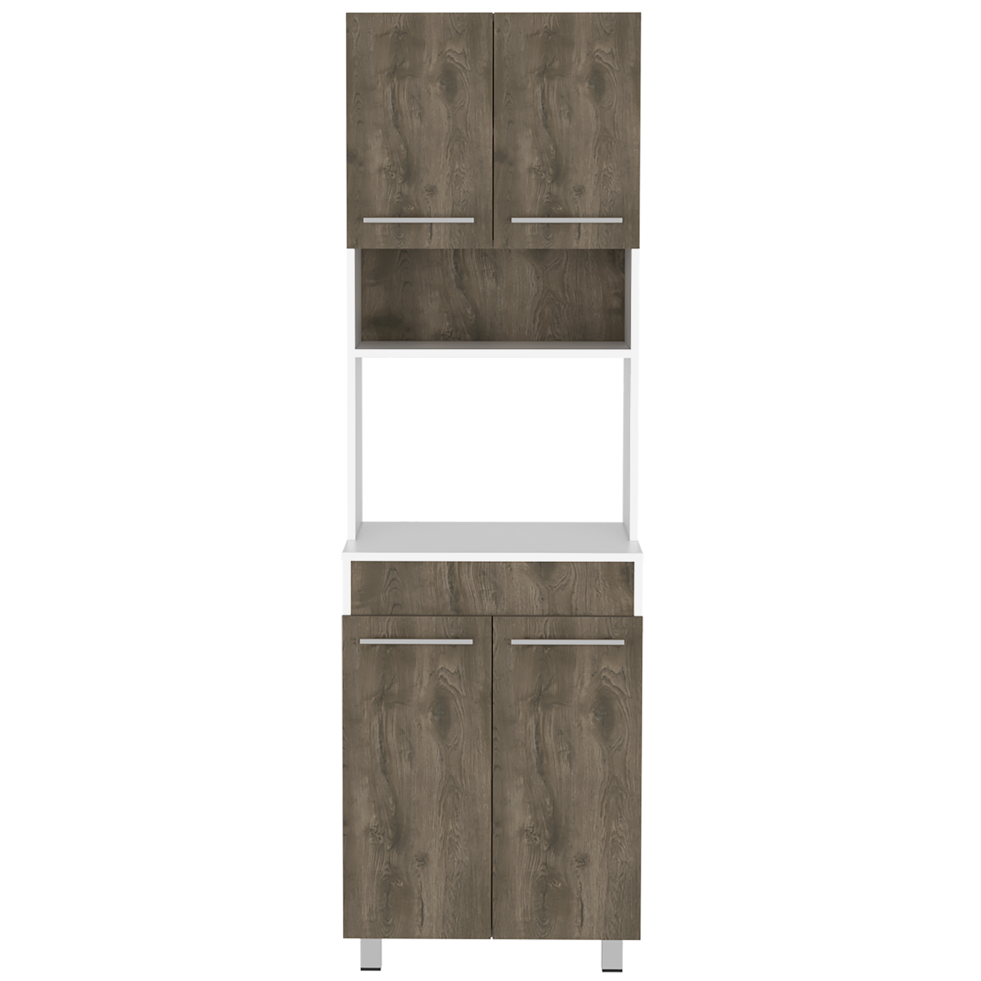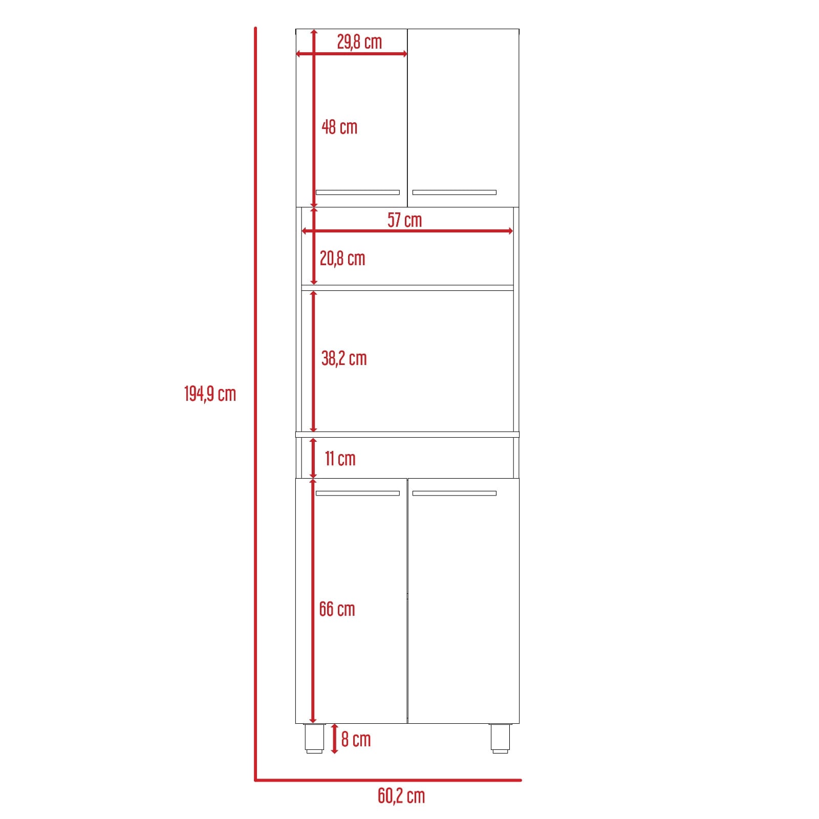 Modulo microondas con cuatro puertas abatibles, espacio central para horno de 56cm, compartimiento superior e inferiro para guardar alimentos , utensilios de cocina y/u otros, manijas en acero inoxidable con medidas de: ANCHO 60,2 ALTO 194,9 PROFUNDO 51,1