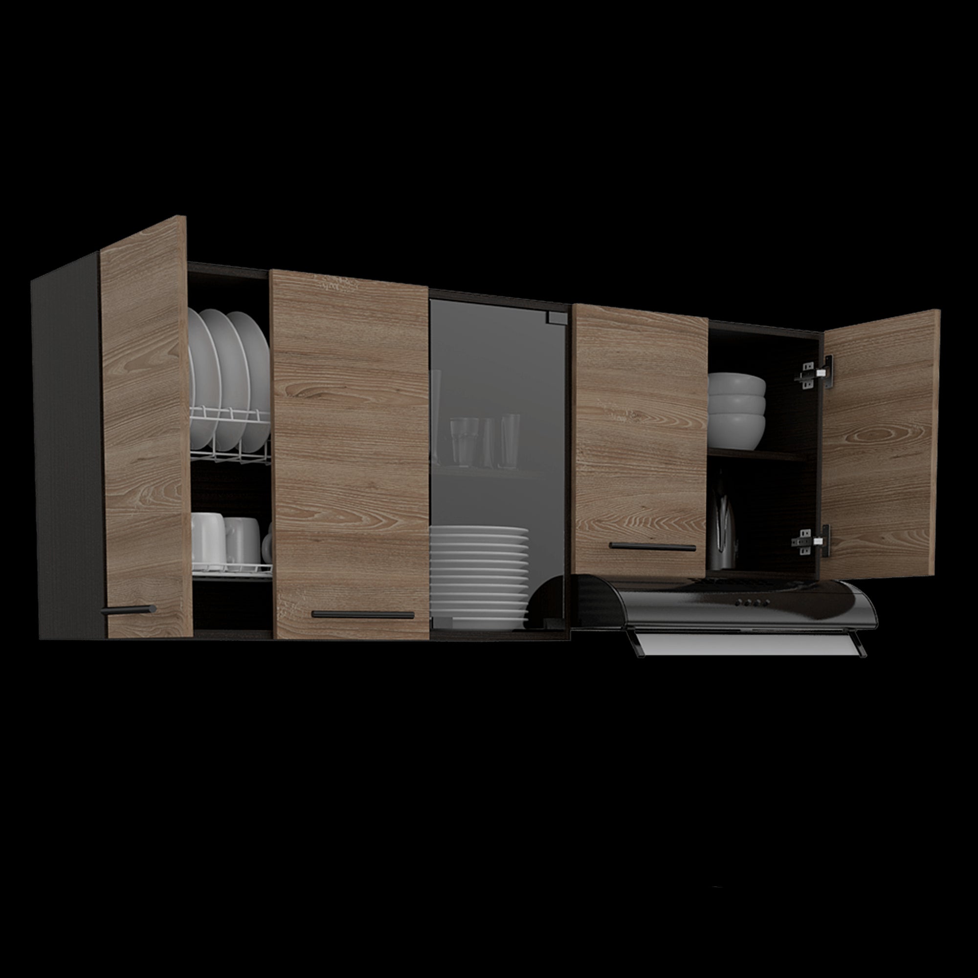 Mueble superior de cocina, con cuatro puertas batientes y una puerta de vidrio, incluye locero y portavasos color blanco, modulo para campana extractora de 60cm, manijas metalicas negras, configurable para mesones con lavaplatos al lado izquierdo o derecho con medidas de: ANCHO 150 ALTO 60 PROFUNDO 31,5