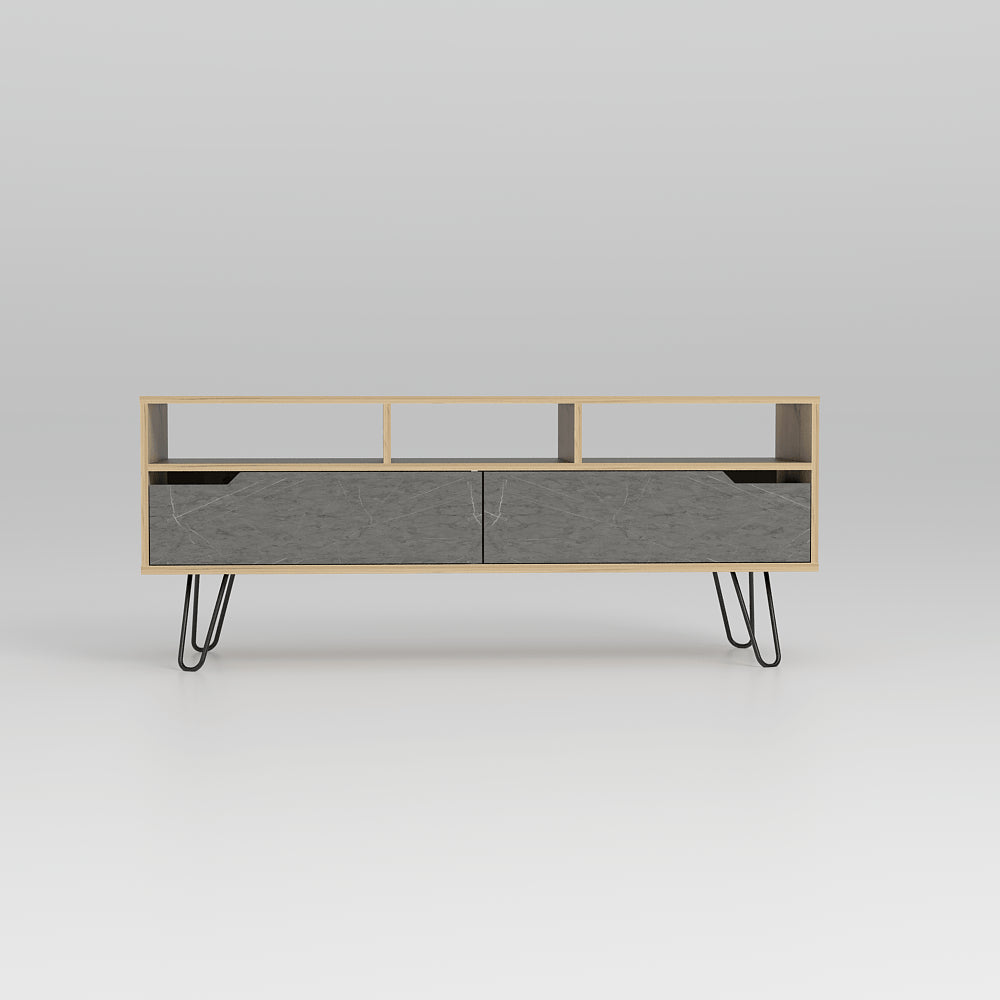 Rack para TV con dos puertas apertuda sin manija, patas metalicas negras, diseño moderno con combinacion de colores con medidas de: ANCHO 137 ALTO 56 PROFUNDO 39