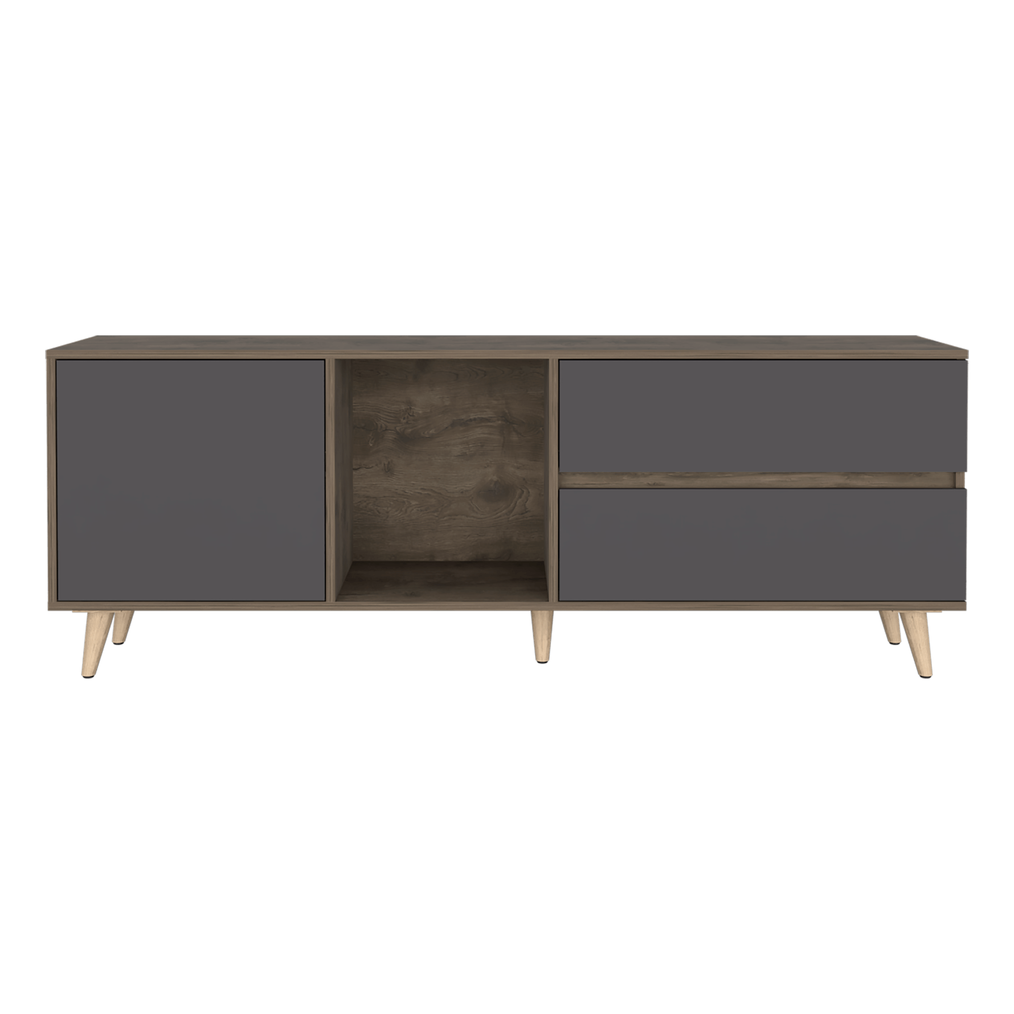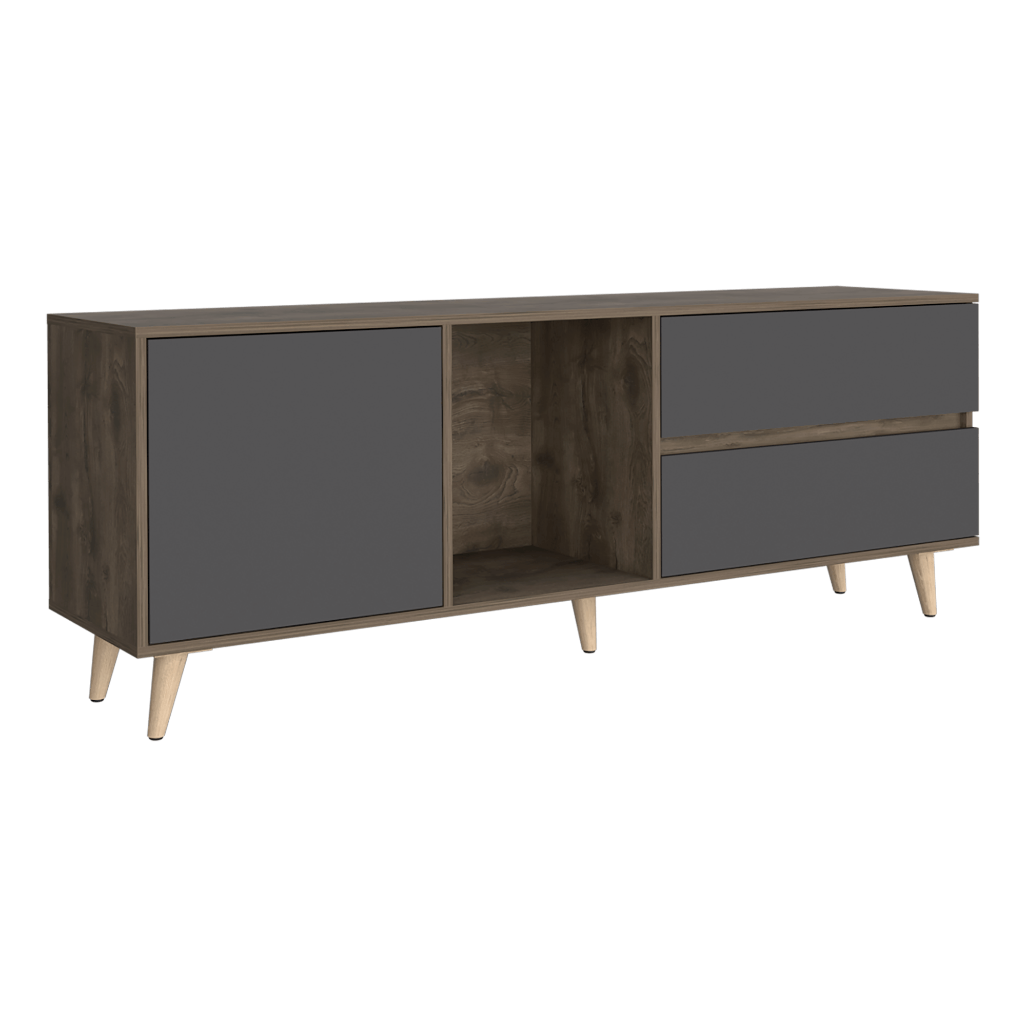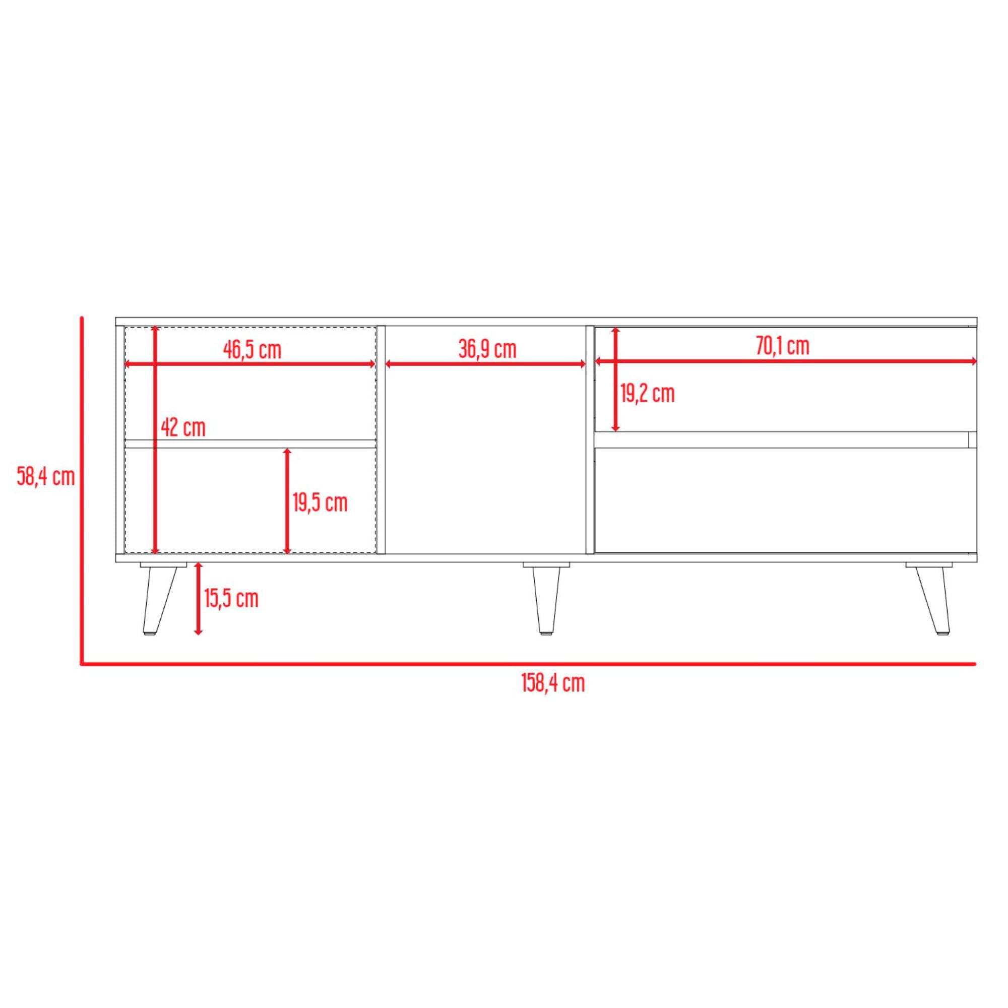 Rack para TV de 65'' maximo, una puerta abatible y dos cajones, espacio para unidades de video o consolas de juego con medidas de: ALTO 60 ANCHO 158,4 FONDO 38