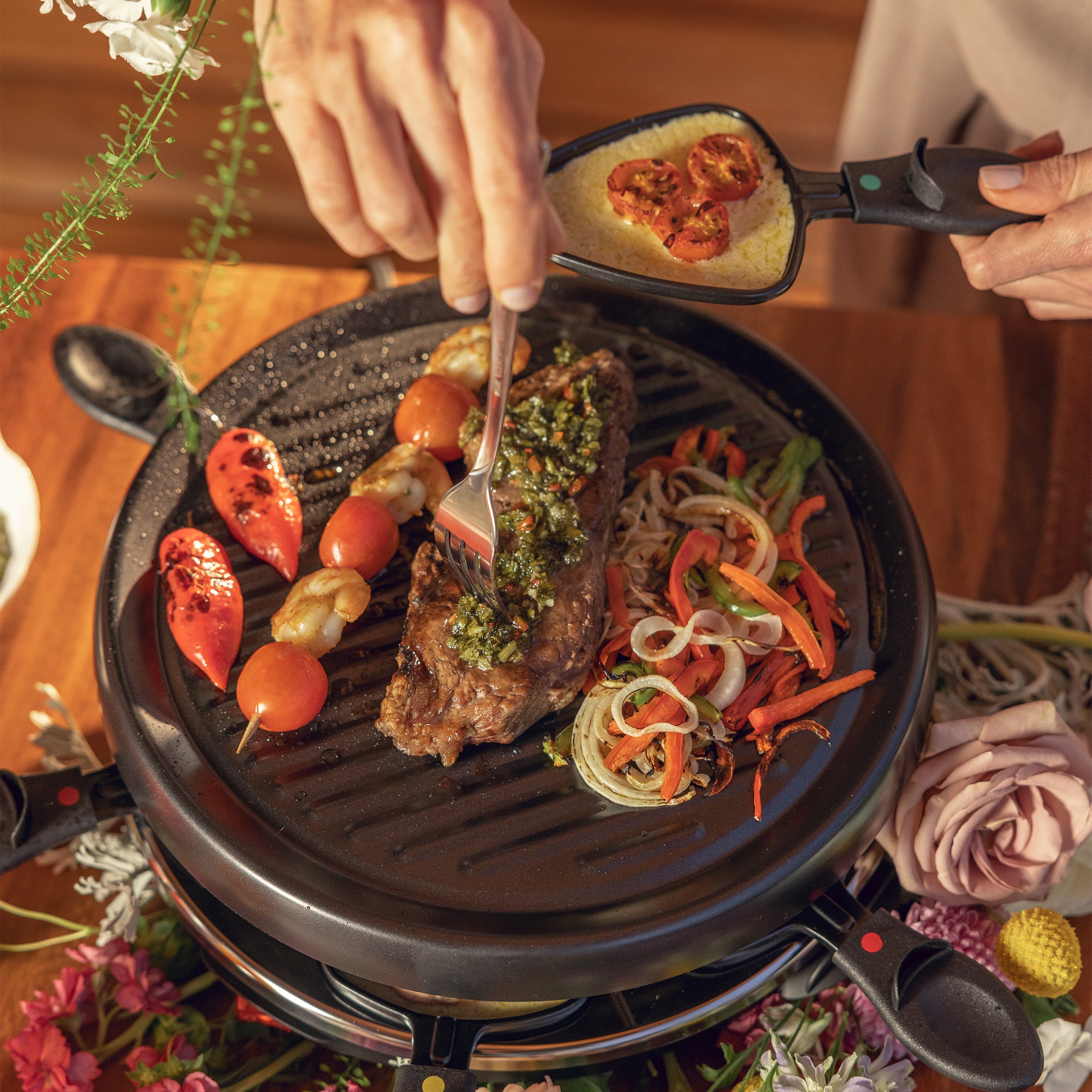 Raclette. Comparte con tu familia y amigos. Perfecta para preparar las mas deliciosas recetas. Su superficie antiadherente ranurada permite dirigir la grasa hacia las orillas para comidas mas saludables. Consérvala por mas tiempo, su cubrimiento interno en acero Inoxidable te garantiza alta durabilidad. Gracias a su botón de encendido/apagado, tendrás todo bajo control. 6 paletas antiadherentes para asar, gratinar y fundir tus ingredientes favoritos. No se moverá de su lugar con su base antideslizante.