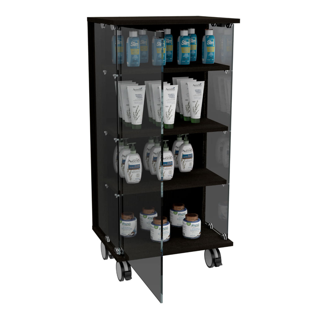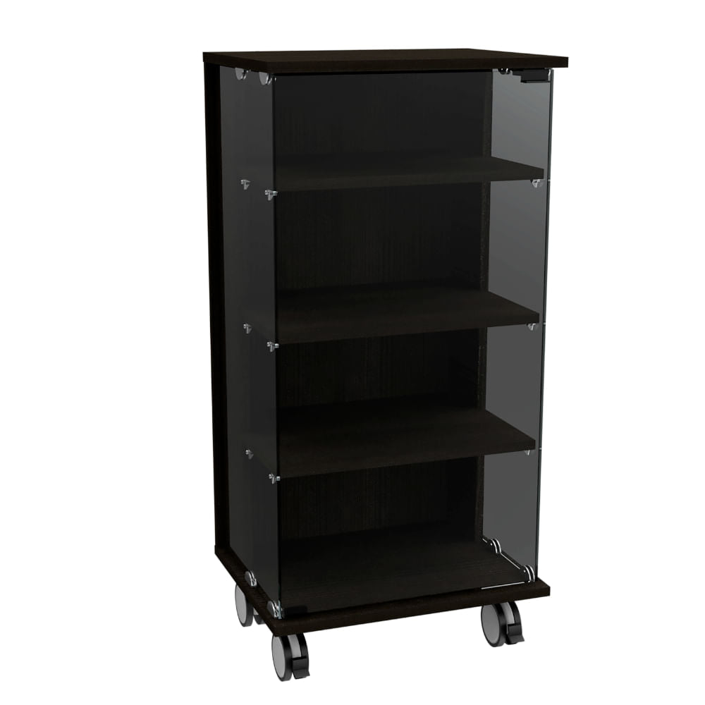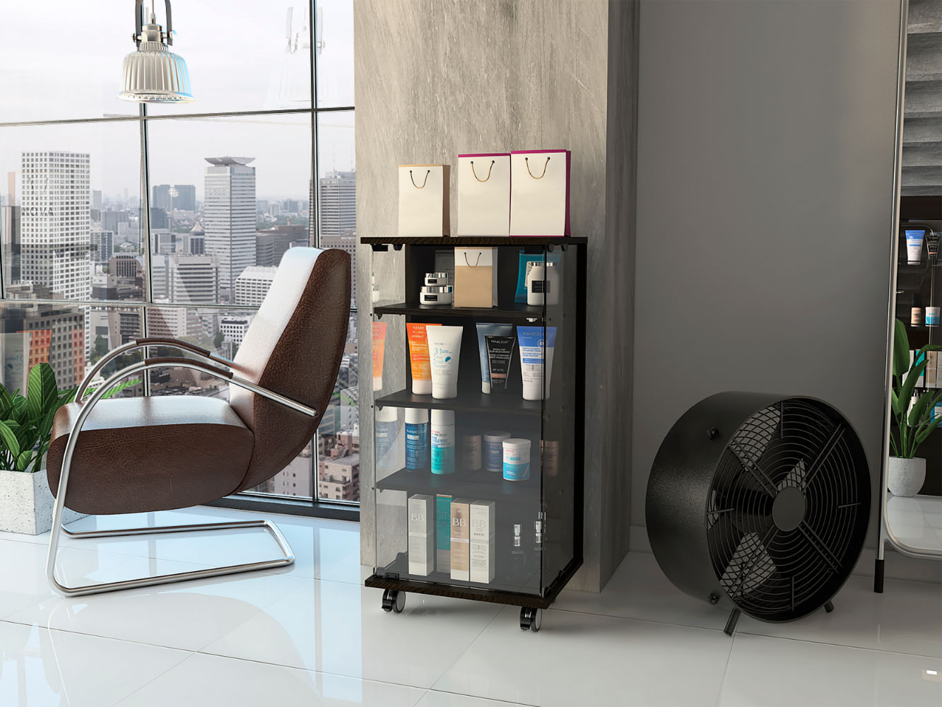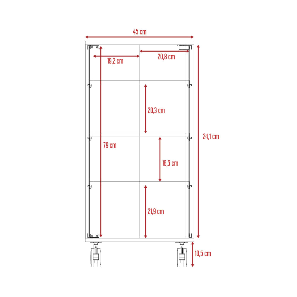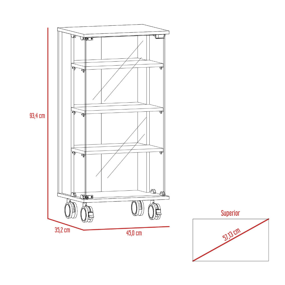 Vitrina para almacenamiento hecha de madera aglomerada de 15mm. Cuenta con una pierta de vidrio y amplios espacios de almacenamiento. Medidas: 93,4cm alto, 45cm ancho, 35,2cm fondo y un peso de 25 kg NO INCLUYE ARMADO, Hecho de madera aglomerada, limpiar en seco, no productos abrasivos, ni humedad alta , La foto de este producto ha sido ambientada, por lo cual no incluye ningún adorno, ni accesorios, ni piezas adicionales ni ningún otro elemento que lo acompañan. El color presentado en la fotografía es una aproximación al color real.